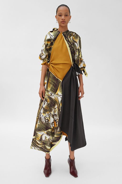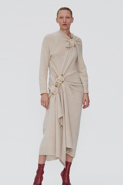 Los volúmenes van a estar muy presentes esta temporada y esta tendencia es realmente visible en los vestidos. Fijaros en los pliegues, en el corte desigual, en el accesorio de circunferencias en tonos dorados que potencia el movimiento.
