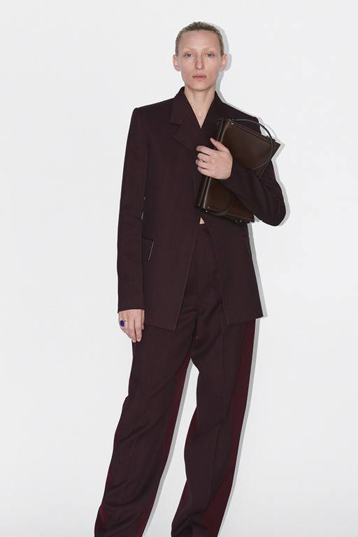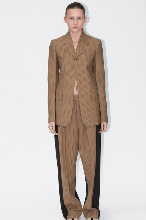 Las líneas van a estar muy presentes esta temporada y se va a mantener la franja de color desigual en los pantalones, tal y como podéis ver en este pantalón de traje. El pantalón tiene una caída recta pero con un corte ancho, que se combina con una chaqueta con el mismo estampado a rayas que los pantalones y bastante larga.