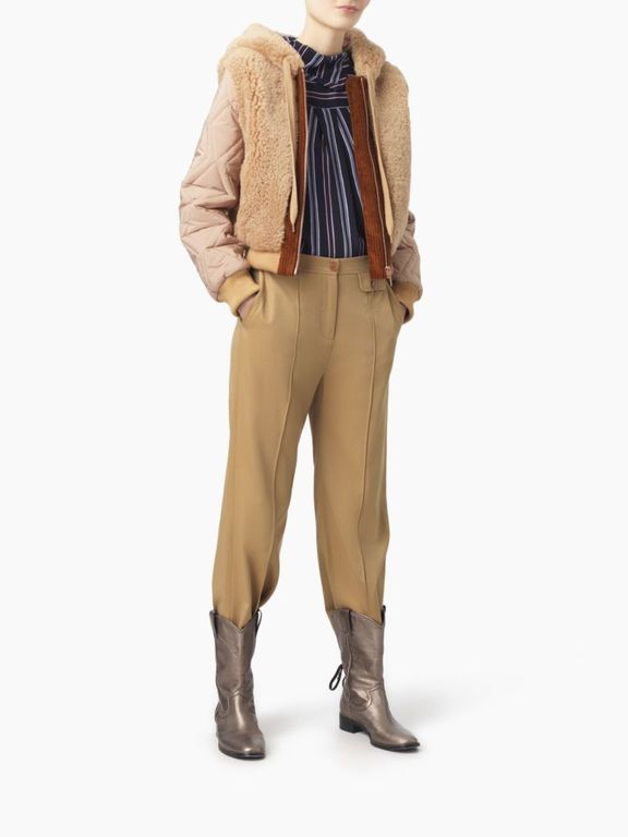 Por otro lado, Chloé se decanta también por los abrigos que cuentan con detalles de pelo, que son tendencia ahora y que ya vimos en el catálogo de Mango para Invinero. En el caso de Chloé, lo encontramos para modelos como la chaqueta a continuación en la que se combinan los detalles de pelo, con los acolchados.