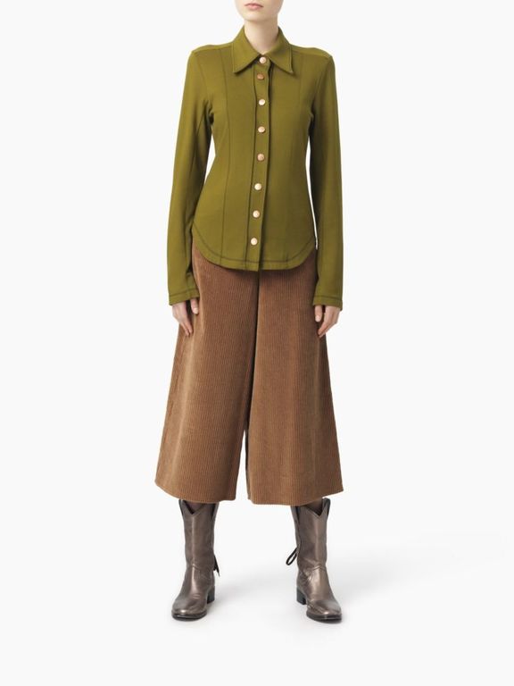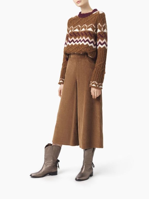 Para los jerséis y camisas que hemos visto, Chloé presenta una amplia variedad de pantalones, con modelos que se imponen como el pantalón de pana que tanto se lleva ahora y que vemos en modelos «culotte» como el que veis a continuación.