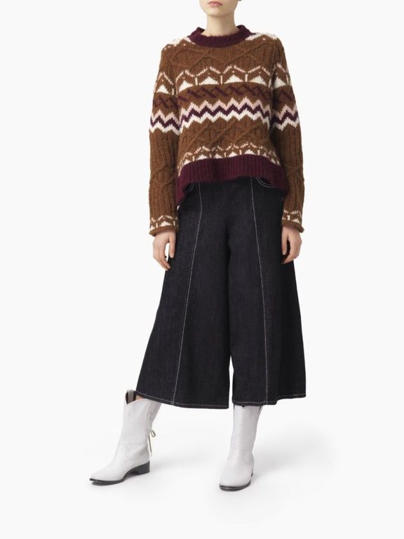 Por otro lado, tenemos también propuesta de jerséis con los que Chloé nos sorprende para esta temporada como es el caso del modelo a continuación. Un jersey que cuenta con un bonito estampado de estilo «patchwork» que cuenta con un estilo «retro» que marca ahora tendencia y que se presenta además en uno de los colores de moda esta temporada: el marrón.