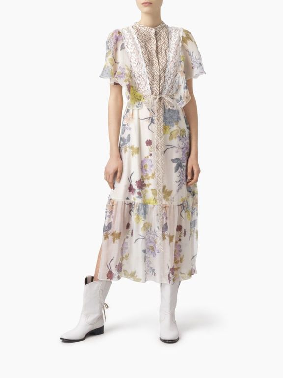 Los vestidos son también protagonistas dentro del catálogo de Chloé apostando sobre todo por modelos como el que os mostramos en la imagen a continuación que cuenta con estampados diversos y detalles como los lazos, que nos llevan de nuevo al estilo «retro».