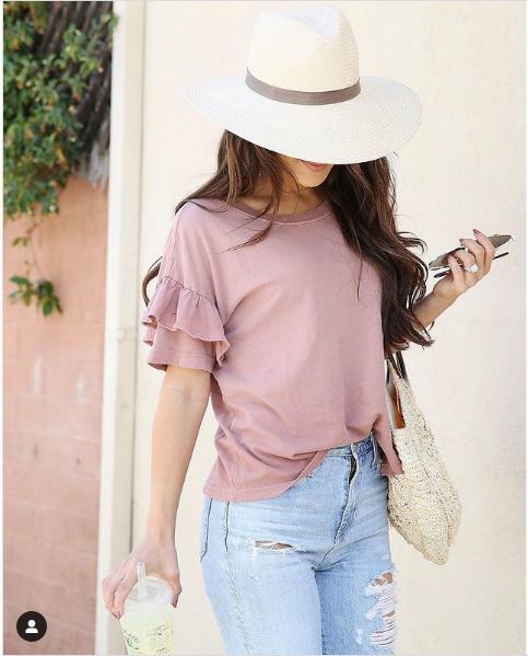 En esta fotografía tenemos un look veraniego de Andee Layne, en el que nos muestra cómo una camiseta rosa puede ser la opción ideal para un look de día. Lo combina con unos jeans altos, ligeramente rasgados, junto con un bolso y sombrero a juego.