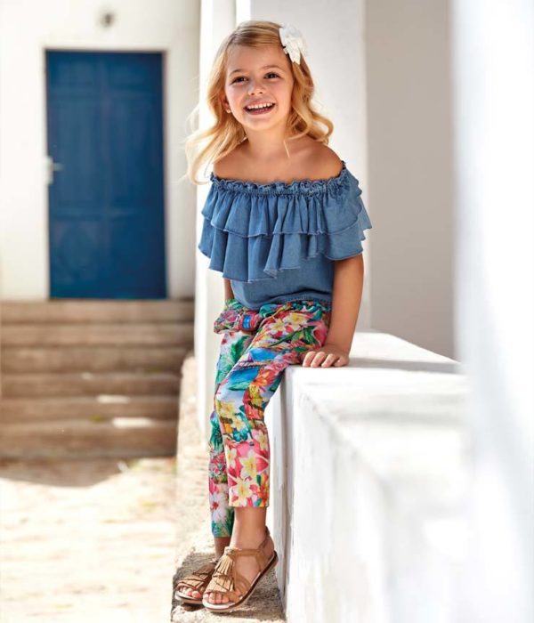 O también los conjuntos de blusas de estilo «denim» conjuntada con un pantalón largo y estampado. Un «look» que nos parece maravilloso para este verano y que puede ser una de nuestras grandes compras en las próximas rebajas de verano de Mayoral.