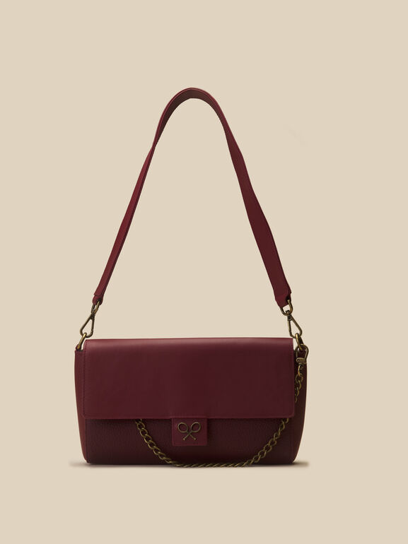En la parte de accesorios, entre las novedades, vamos a destacar este bolso en color burdeos, confeccionado en piel, con correa combinada en piel y cadena dorada. Podéis encontrar este mismo bolso en color negro.