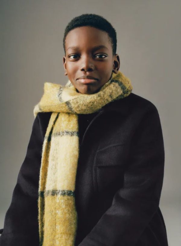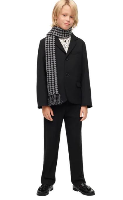 Otra opción igual de buena en basar el outfit en las prendas mas exteriores, sobre todo si vamos a pasar varios momentos fuera de casa. En este caso nuestro hijo puede lucir un elegante vestido negro acompañado de una bufanda de colores verdes, que será lo que de el toque de color al look.