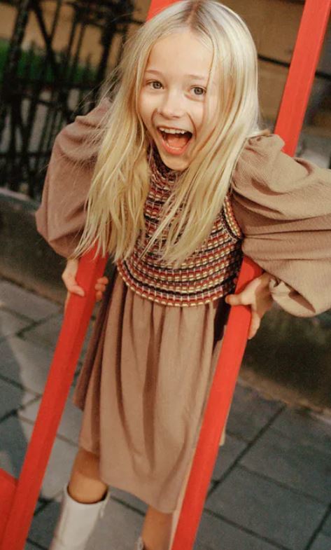 También pueden lucir un bonito vestido marrón clarito y ponerse algo encima, como esta especie de chaleco, por si ese día hace algo mas de frio y asi evitar que se pongan malos. Lo bueno es que el chaleco combina perfectamente, pero si lo consigues de otro color cuentas cpn la ventaja de que el marrón es un color sencillo para combinar.