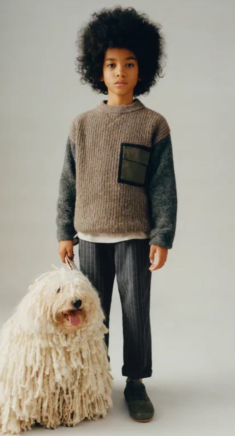 Otro outfit muy chulo y que se basa en un jersey es este, aunque en esta ocasión será de tonos grises y verdes, con un bolsillo grande en el que pueda guardar alguna golosina. Muy bien acompañado con un pantalon gris a rayas y unos brillantes zapatos negros.