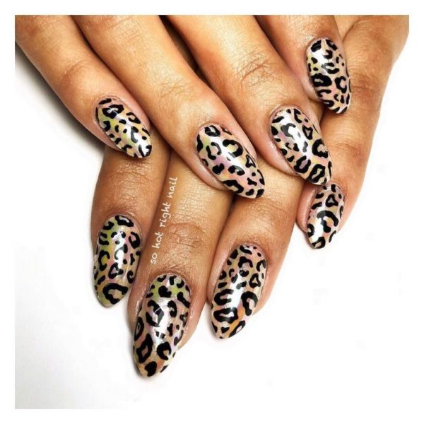 Las uñas almendradas se prestan también a que para ellas, elijamos un diseño «animal print» ya que estos son ahora tendencia. De este modo, podéis elegir un diseño como el que os mostramos que cuenta además con un bonito efecto metalizado.