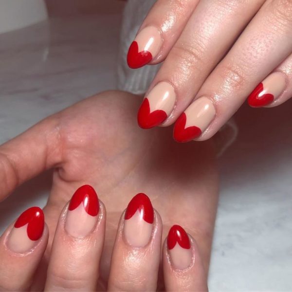 Las uñas almendradas son ahora tendencia de modo que podemos elegirlas también como las uñas que llevar en un día tan importante como es la celebración de San Valentín. De este modo, podéis elegir algo similar a lo que vemos en este diseño, inspirado en la manicura francesa, en la que a partir del color nude y el color rojo, se crea un bonito corazón con forma almendrada.
