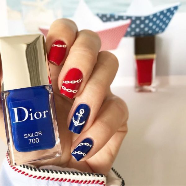 Y si quieres algo llamativo, nada como elegir una combinación entre el azul y el rojo para tus uñas. De este modo podrás llevar una manicura como la que te mostramos a continuación: