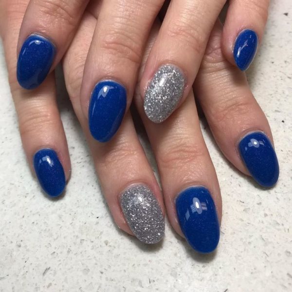 También nos podemos decantar por pintar nuestras uñas de un bonito color azul como este que vemos, dejando uno de los dedos para pintarlo con un esmalte que sea glitter puro y en gris.