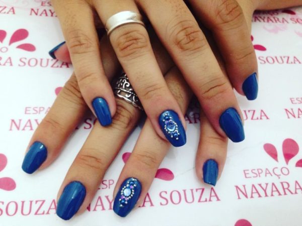 Otro de los diseños de uñas azules que os queremos proponer es este que os mostramos. Unas uñas en un azul fuerte combinadas con unas piedras adhesivas, formando un dibujo en una uña de cada mano. Un bonito diseño por si por ejemplo, tenéis que asistir como invitadas a una boda.