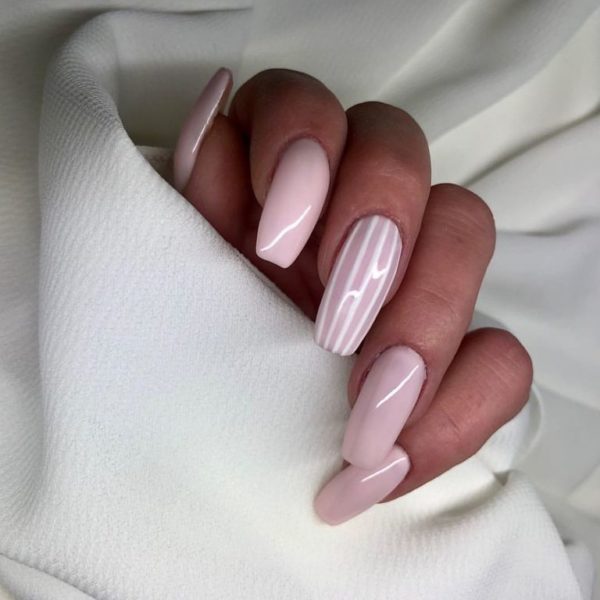 Otro diseño que podemos escoger para nuestra decoración de uñas beige es este que os mostramos a continuación, en el que unas uñas beige tirando a rosado, se combina con un dibujo de rayas. Otro diseño sencillo para todo tipo de ocasiones.