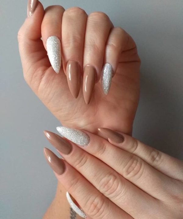 También para nuestras uñas beige con glitter nos podemos decantar por aquellas que cuentan con un diseño algo más elaborado. En este sentido, podemos elegir un diseño como este, que cuenta con el color beige como base, y suma un efecto glitter en gris claro que es perfecto para hacer que nuestras uñas resalten más.