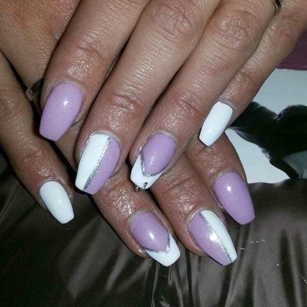 Por otro lado, también podemos decantarnos por pintar las uñas de color blanco y combinar este color con otro que también sea tendencia como por ejemplo, el color lila que además combina a la perfección con un tono como el blanco. Puedes hacer así como en este diseño en el que las uñas se dividen para poder tener los dos colores pero sin que se mezclen.