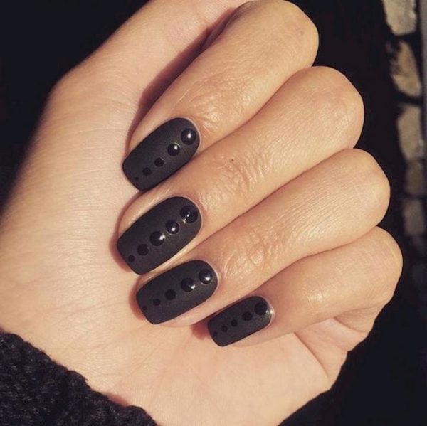O podemos llevar unas modernas uñas negras de porcelana como estas que vemos con detalle de tres lunares en el mismo color.
