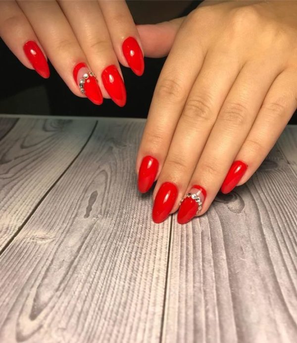 De manera especial queremos hablaros del color rojo sobre vuestras uñas de porcelana teniendo en cuenta, que este color resalta de manera especial sobre una uñas de este tipo, y son tendencia si elegimos un acabado brillante como en este diseño que os mostramos que además suma la apuesta por unos pequeños brillantes para una de las uñas.