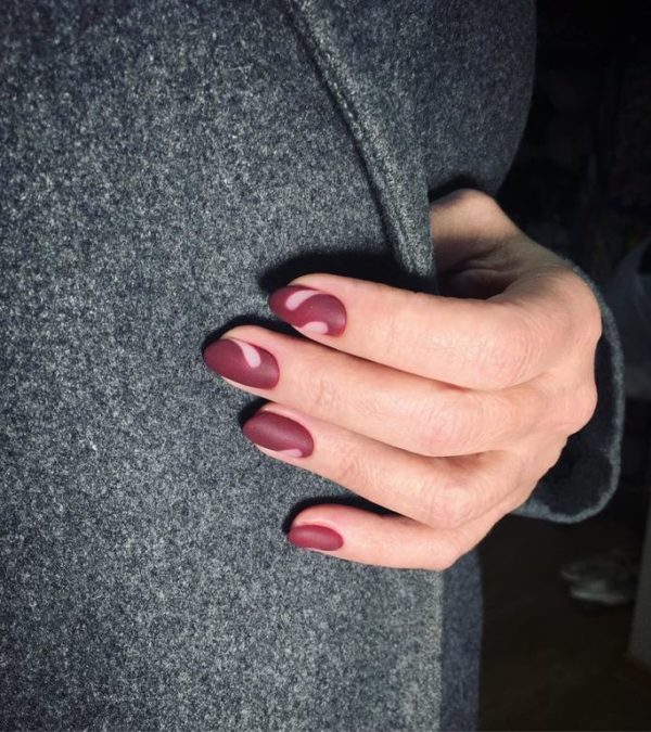 O también nos podemos decantar por un diseño en el que pintemos las uñas con un color de moda, como el antes mencionado color vino, dejando una parte de la uña sin pintar, de manera que puedas crear un dibujo como este que os mostramos: