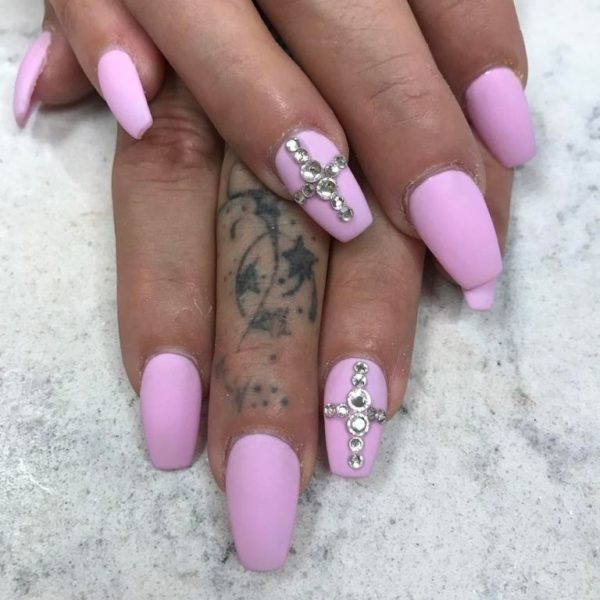Los diseños con brillantes son también una buena idea para lucir unas uñas rosas con mucho estilo. Son fáciles de pegar y además si los colocas sobre una base en un rosa muy clarito, como vemos en esta imagen a continuación, seguro que resaltarán mucho más.