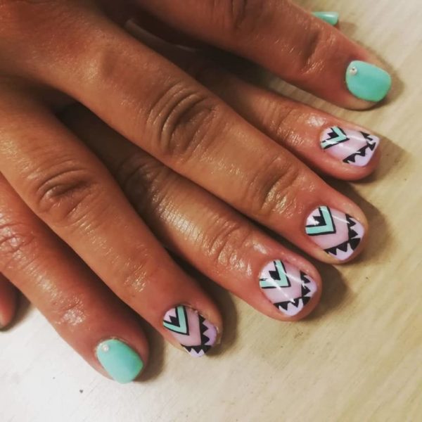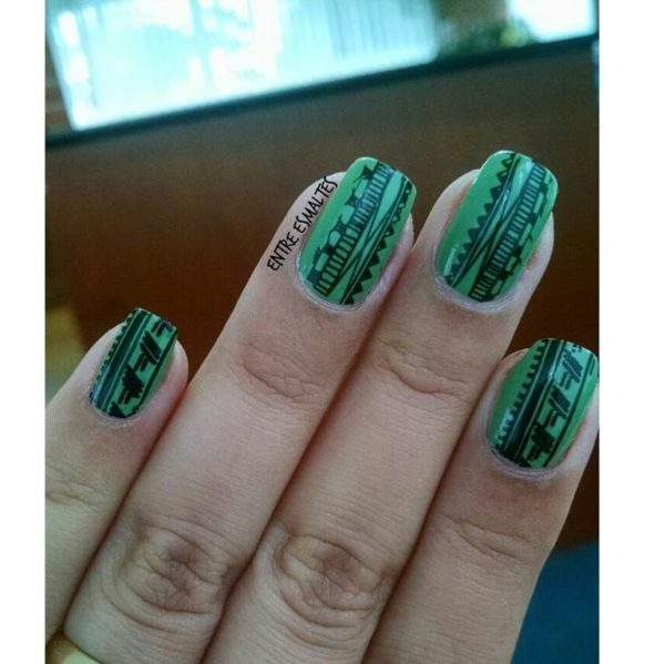 Otra de las opciones que podemos elegir para nuestros diseños de uñas tribales, es la de elegir un color en concreto, o dos y a partir de estos elegir hacer un dibujo tribal sencillo como este que os mostramos, que consiste en unas bonitas uñas verdes, que cuentan con diseño tribal gracias a esas líneas y figuras geométricas en negro.