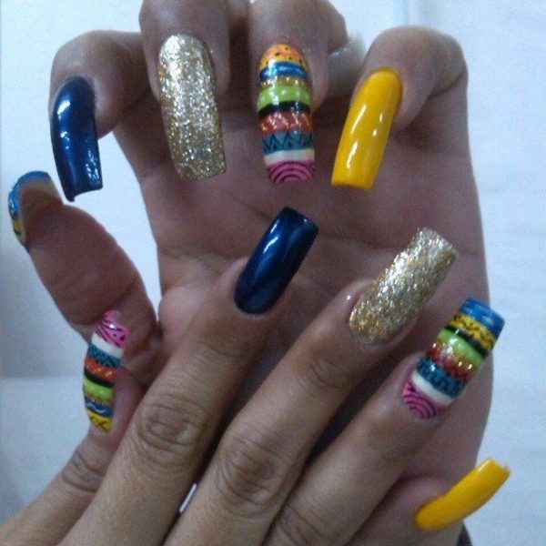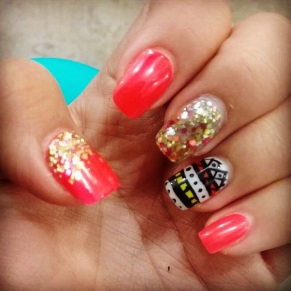 También podéis hacer algo que sea más llamativo, con unas uñas tribales combinadas con glitter como estas que os mostramos a continuación, las cuáles cuentan con colores llamativos, aunque optando por la misma tendencia de pintar una sola uña con el estilo tribal y dejar las otras para cubrirlas de glitter.