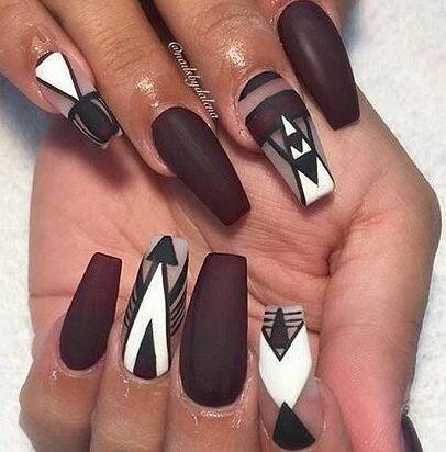 Si en cambio no deseas algo que sean tan llamativo o quizás buscas unas uñas tribales que poder lucir en invierno, nada como elegir este otro diseño que podéis ver ahora, el cuál cuenta con un elegante acabado en mate, combinando con otros tonos tendencia, como el borgoña.