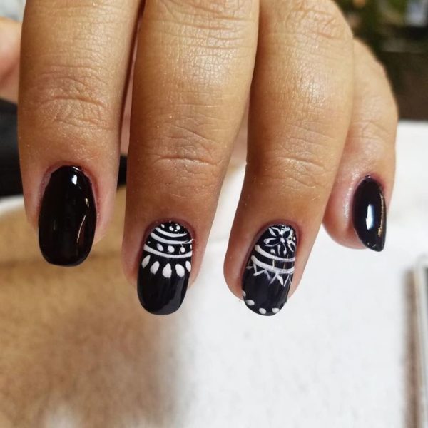 Por otro lado, te puedes decantar también por otro sencillo y bonito diseño de uñas tribales en blanco y negro como este que os mostramos, con una base de color negra, creando el dibujo tribal en blanco a partir de rayas, líneas, curvas y hasta flores.